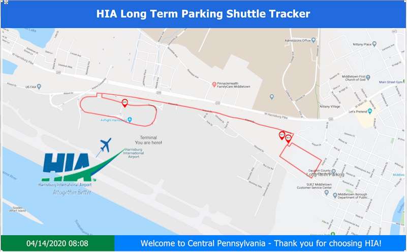 They display a live shuttle bus map feed which sits inside Repeat Signage software, onto which they display their HIA logo, header, footer, time and date and RSS feed messages for travellers at the shuttle bus stops.